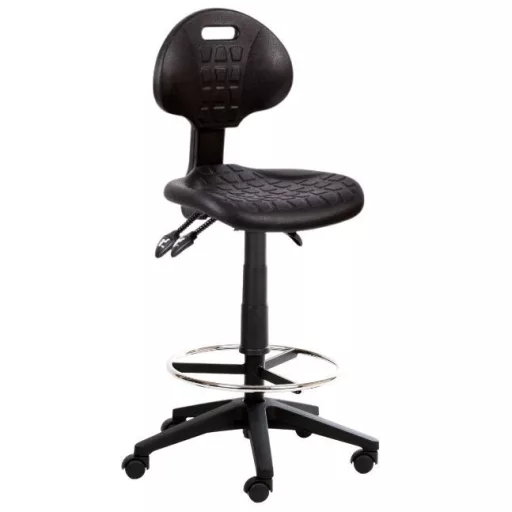 Az ülőfelület és a háttámla strapabíró, vegyszerálló poliuretán anyagból készül, amely kiválóan ellenáll az ipari környezet kihívásainak, miközben könnyen tisztítható, így megfelel a higiéniai követelményeknek. Ez különösen fontos laboratóriumi és egészségügyi környezetben.