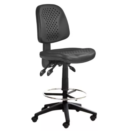 Az ülőlap és a háttámla strapabíró poliuretán anyagból készült, amely nemcsak tartós, de könnyen tisztítható is, így különösen alkalmas olyan munkahelyekre, ahol por, vegyszerek vagy más szennyeződések fordulhatnak elő.