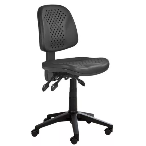 Az ülőlap és a háttámla strapabíró poliuretán anyagból készült, amely nemcsak tartós, de könnyen tisztítható is, így különösen alkalmas olyan munkahelyekre, ahol por, vegyszerek vagy más szennyeződések fordulhatnak elő.